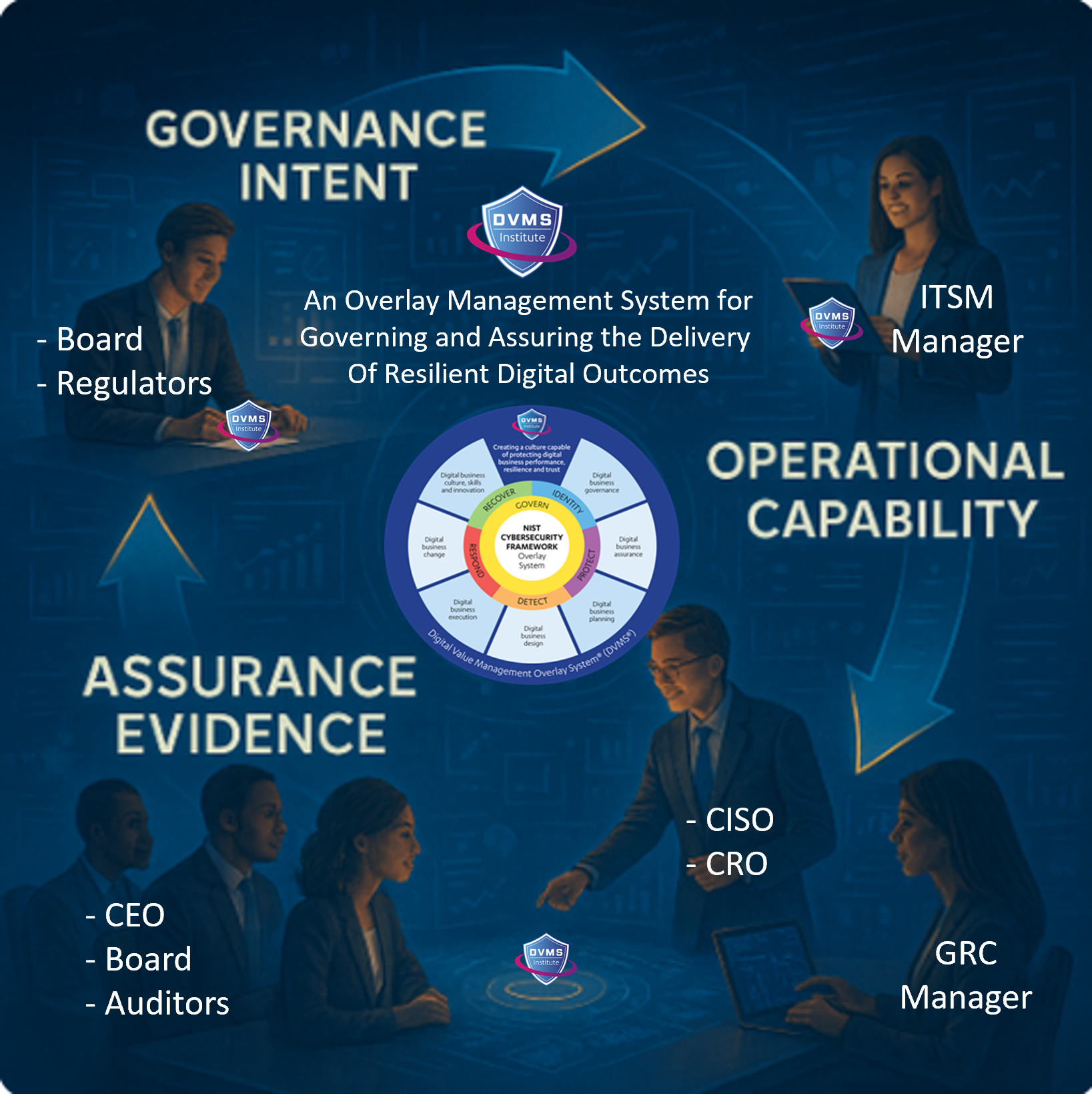 A Digital Value Management System (DVMS) transforms systemic cyber risk into operational resilience by uniting Fragmented Frameworks and Standards, such as NIST, ITSM, GRC, and ISO, into a holistic, adaptive, and culture-driven Governance, Assurance, and Accountability overlay system that keeps your digital business Resilient, no matter the disruption.