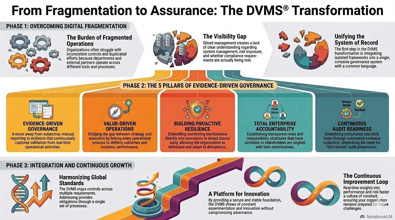 The DVMS does not promise that frameworks will suddenly disappear. It promises that they will stop competing to define your reality. The overlay determines your reality. Frameworks contribute to it. That is the difference between having “a lot of GRC activity” and having an operating model capable of delivering GRAA.