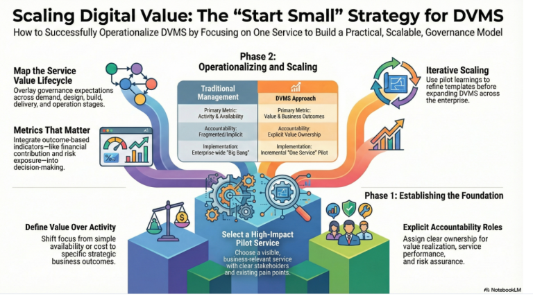 This approach allows value to be clearly defined, accountability to be established, risk to be managed, and performance to be assured. More importantly, it demonstrates that DVMS is not theoretical—it is operational. A single service becomes the catalyst for cultural change, governance maturity, and sustained digital value across the enterprise.