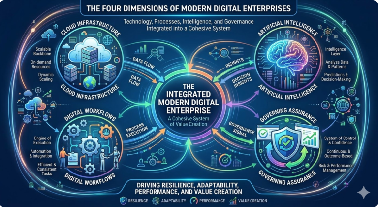 Modern digital enterprises are no longer defined solely by their technological stacks but by how effectively they integrate technology, processes, intelligence, and governance into a cohesive system of value creation. As organizations evolve, four critical dimensions have emerged as the foundation to success: cloud infrastructure, digital workflows, artificial intelligence, and assurance-based governance. Each dimension represents a distinct capability, but their true power lies in their collective operation as an integrated, adaptive system. Organizations that understand and align these dimensions are better positioned to navigate complexity, deliver value, and sustain performance in an increasingly dynamic environment.