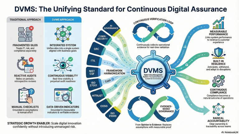 In this new reality, organizations require a systemic, integrated approach that not only monitors digital operations but also actively assures their performance, resilience, compliance, and accountability. The Digital Value Management System® (DVMS) emerges as this new standard, purpose-built to govern complex digital enterprises through evidence-driven, continuous assurance.
