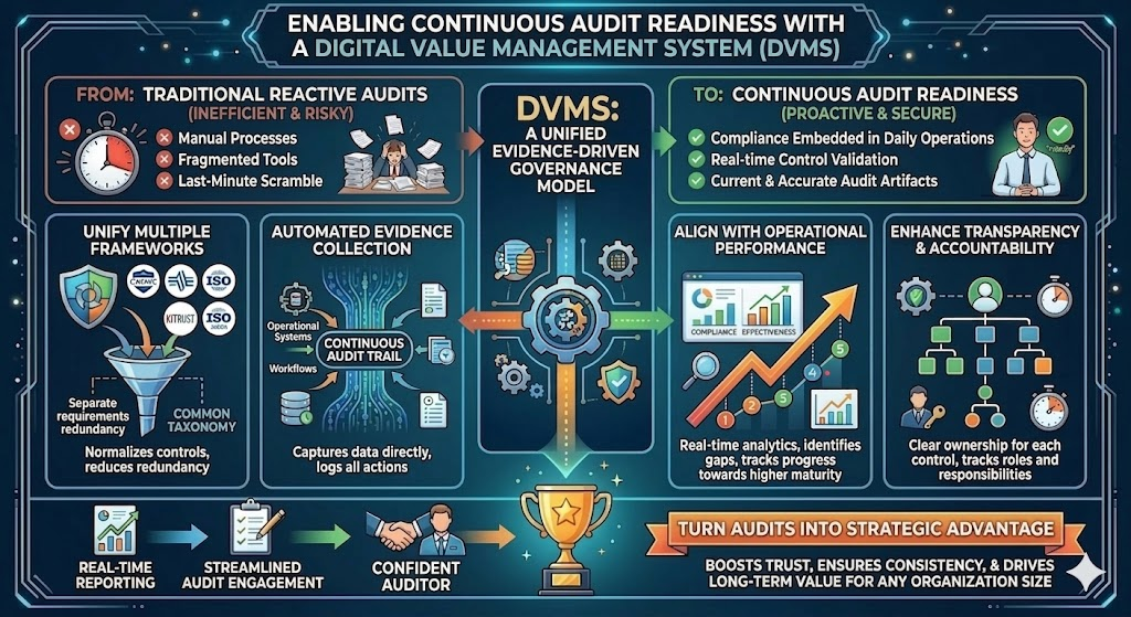 In today’s regulatory and risk-intensive environment, organizations of all sizes face mounting pressure to demonstrate compliance with a growing number of standards and frameworks. From CMMC in the defense sector to ISO 27001 for information security, HITRUST in healthcare, and ISO 20000 for service management, the expectation is no longer periodic compliance but continuous audit readiness. Traditional approaches to audits, which rely on manual processes, fragmented tools, and last-minute preparation, are increasingly inadequate. A Digital Value Management System (DVMS) addresses this challenge by providing a unified, evidence-driven governance model that enables organizations to continuously pass audits while delivering board-level assurance of resilience, accountability, and operational performance across fragmented digital ecosystems.